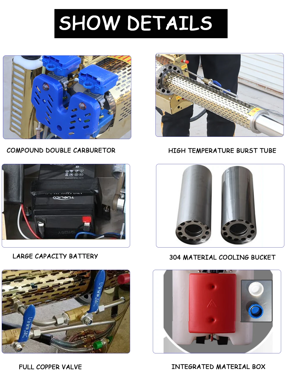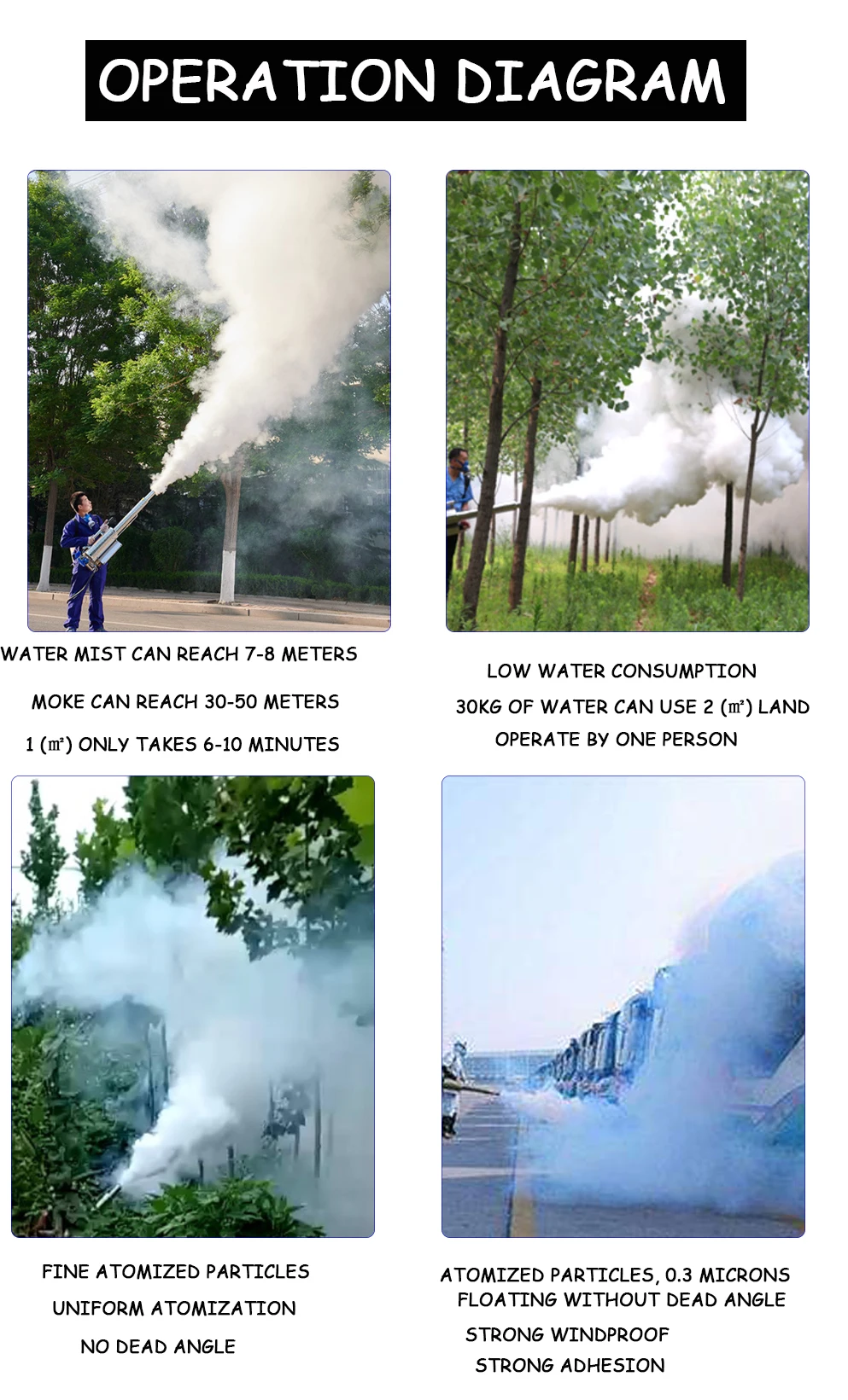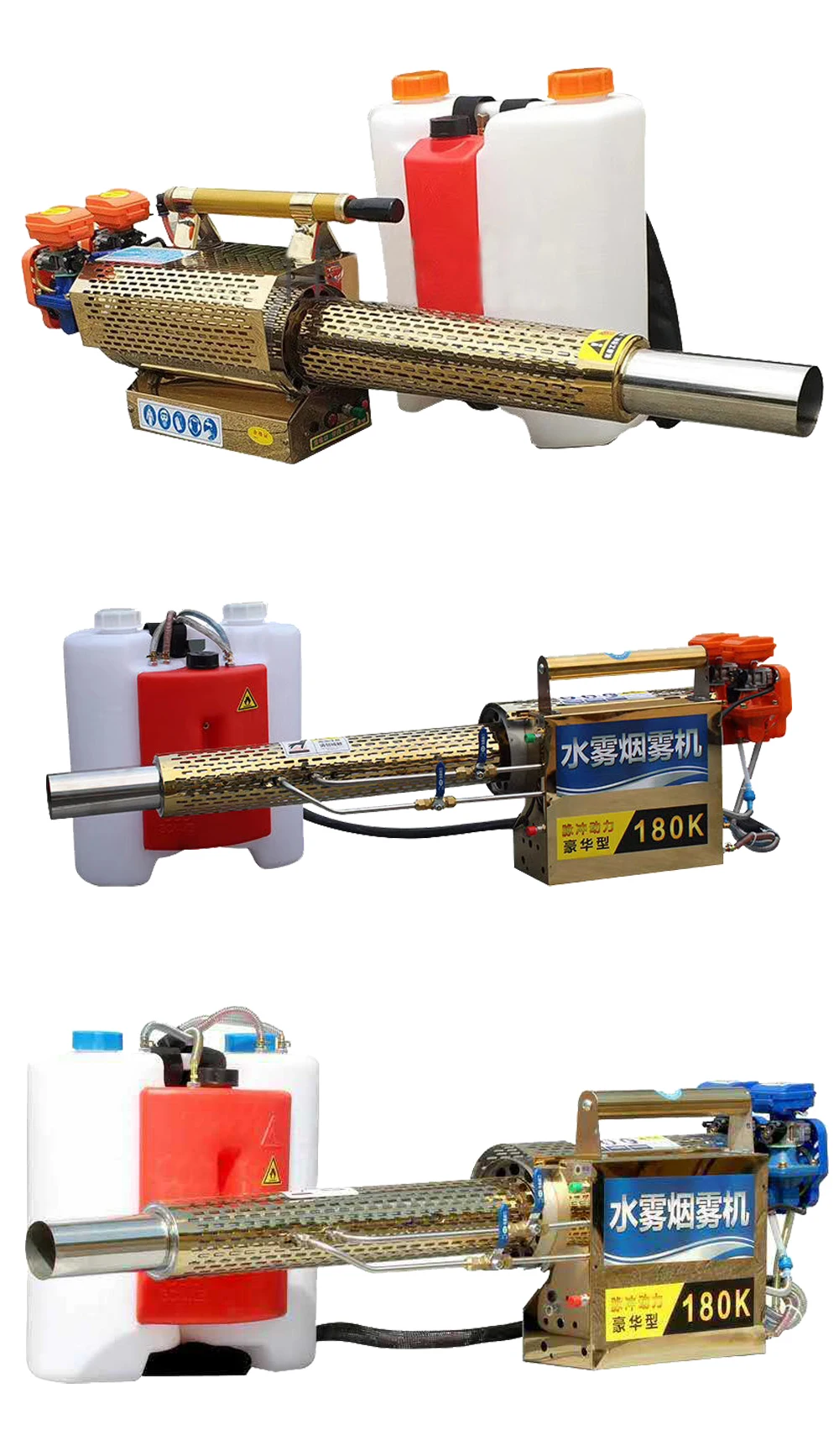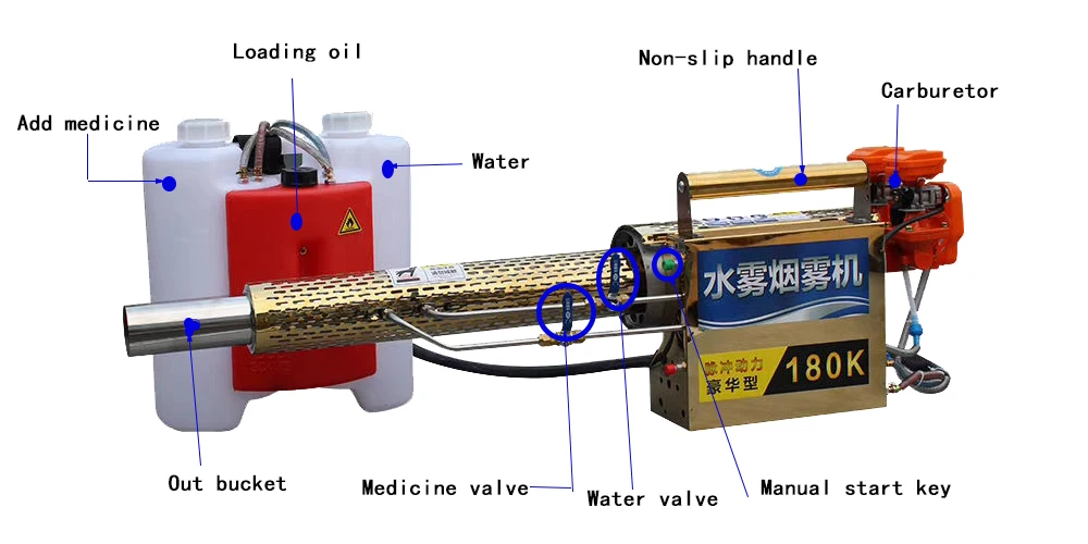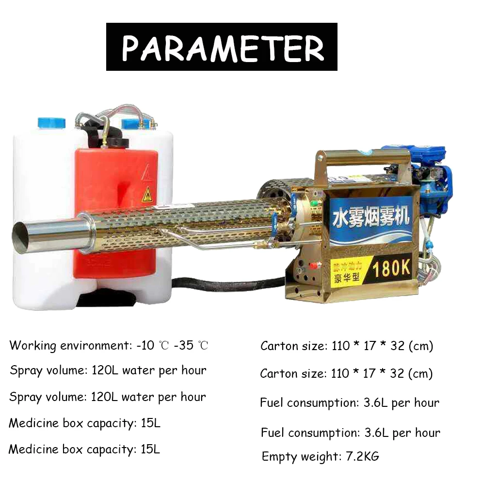 The thermal foggers are mainly used in pest control and fumigation control of public places such as houses, restaurants, shops, warehouse, school communities, hospitals, etc. and is widely used in health and epidemic prevention departments, military bases and vegetable greenhouses. It can quickly kill outdoor gardens, insects, mosquitoes, etc. to eliminate epidemic prevention operations.Working environment: -10 ℃ -35 ℃Spray volume: 120L water per hourIgnition power: 12V rechargeable batteryMedicine box capacity: 15LMailbox capacity: 2LCarton size: 110 * 17 * 32 (cm)Power: 92 # and above gasolineFuel consumption: 3.6L per hourService life: more than 10 yearsEmpty weight: 7.2KG