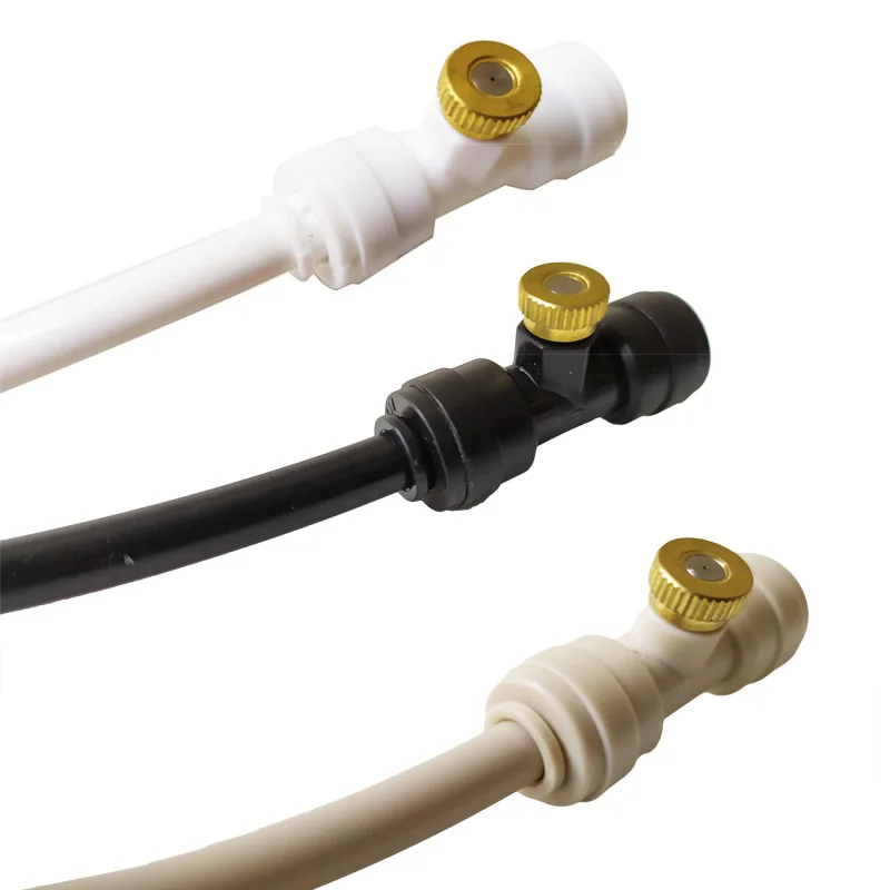 Tube: 1/4‘’ (6.35mm) PE tubeNozzle material:Brass Nozzle Size :0.4mm OrificeOperating Pressure:10-70kg/cmSpray Volume:0.15 cc/minApplication: Cooling/ Misting/