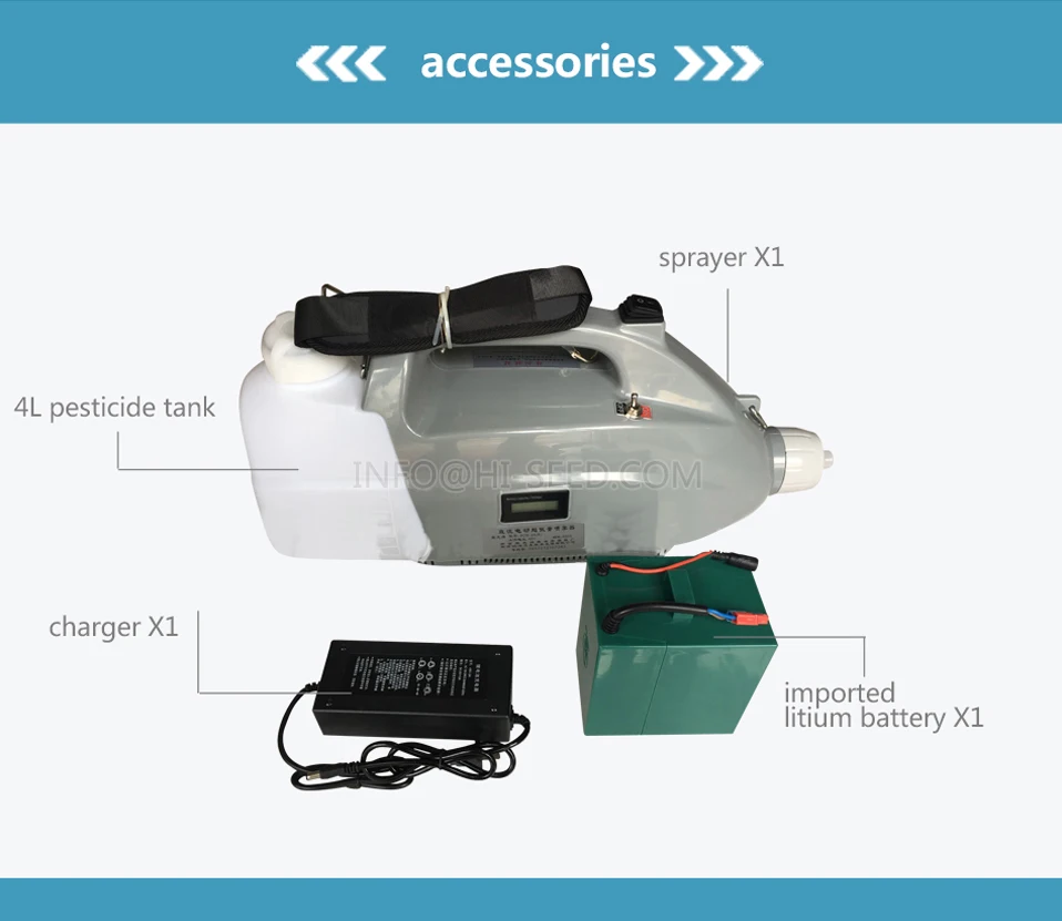 Model HDB-4AMedicine box capacity 4LSpray volume 0-980ML / MINDroplet size 0-50 microns (adjustable)Static wind range 0-11 meters Working hours 1-4hoursRated voltage 48V power:480WNet weight 3.5KG (including battery)Stepless speed regulation Static wind rangeSpray nozzle 3 nozzle (Large middle & small)Features,Cordless and portable Long working hoursLong injection spraying rangeStepless speed regulationAdjust the regulating valve to control the particle size, according to actual needs Easy-to-use handle switchStrong air supply, rapid diffusion, stable atomizationFirst, low sound, reducing work noise, silently moisturizingSecond, the capacity is five liters.Third, the material is hard, using engineering materials to extend service life,Fourth, anti-fall and wear-resistant, large amount of fog,The atomization system is high power, strong and powerful, adjustable size, humidification of crops, convenient and labor-saving