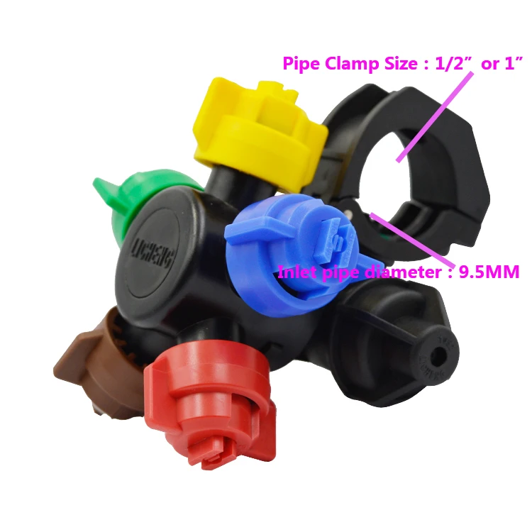 agriculture multi head sprayer with clamp is consist of nozzle body, nozzle filter, quick connect cap, and nozzle tip.