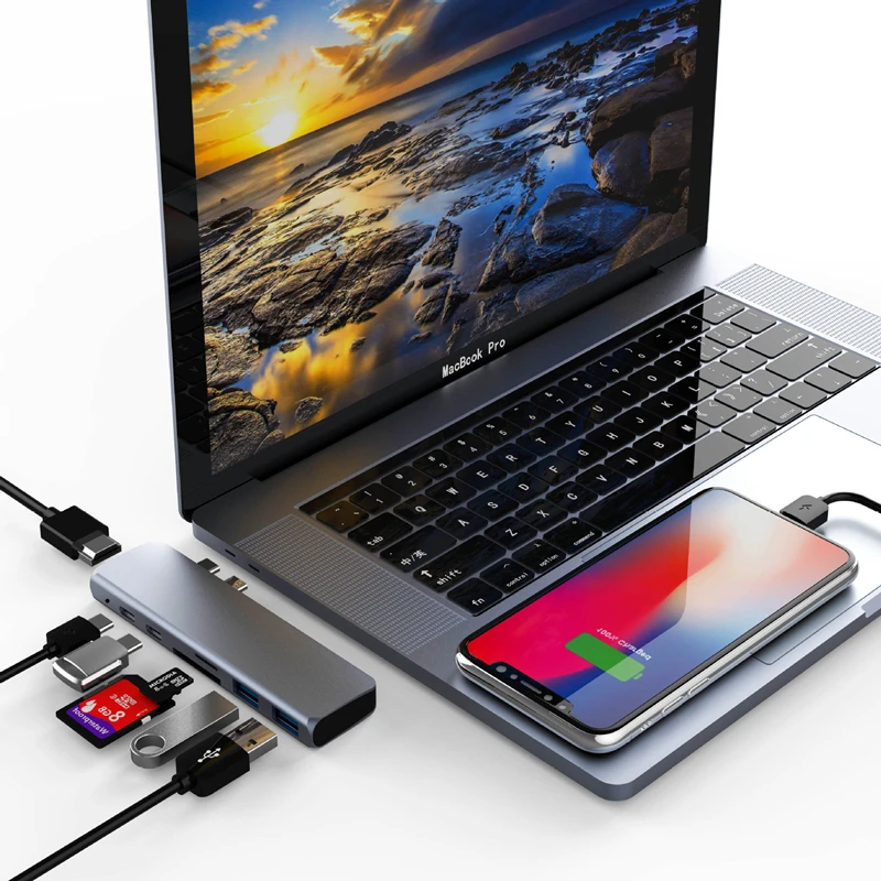 USB Type C Hub Adapter 7 in 1 Dual USB Type C Dock for MacBook Pro with 4K HDMI USB C USB3.0 SD/MicroSD Card Reader