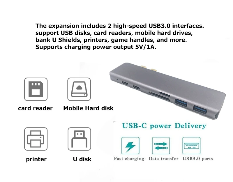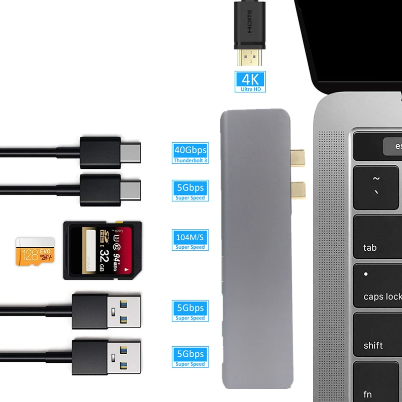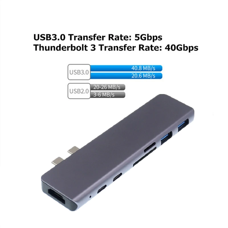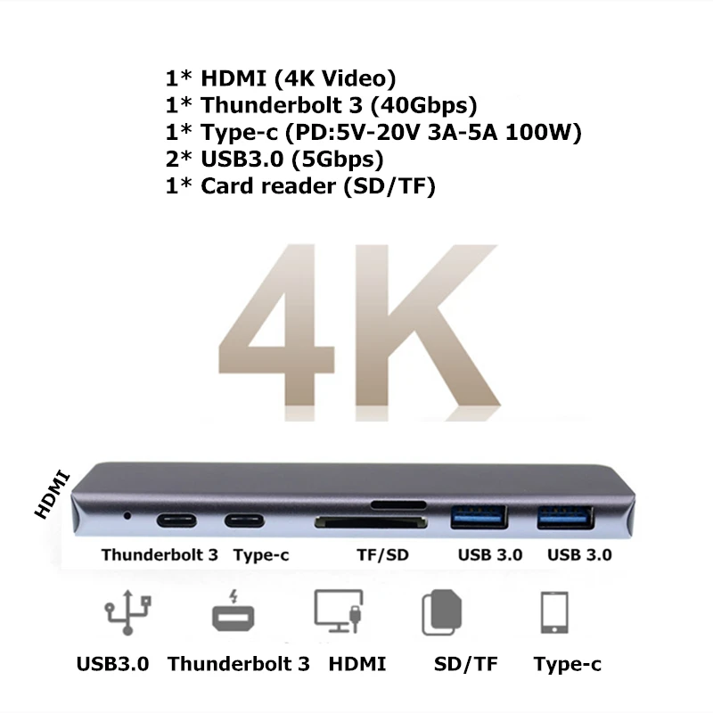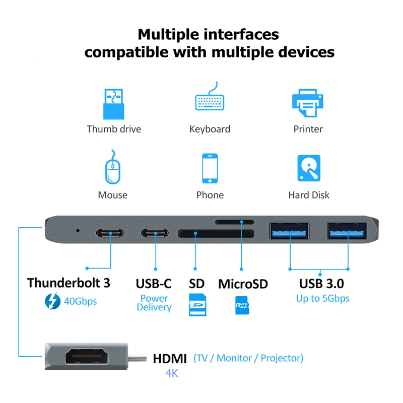 Type 1: Type-C to HDMI/Thunderbolt3/Type-C/USB 3.0*2/SD/TF;Type 2: Type-C to HDMI.Output Interface Features:1.USB 3.0: 5Gbps transfer rate, 5V/1A, compatible USB2.0, Plug and Play2.HDMI: 4K (3840x2160)/1080P/720P. 3.USB-C: PD,only charge,not support data transfer.4.Thunderbolt 3: 40Gbps transfer rate,Data transfer, bidirectional charging, video transmission.5.SD/TF: SD(HC)/SD XC/MMC/Micro SD(TF), Data storage capabilitiesType 1 Compatible Decice:Macbook Pro 13" 15", New Macbook Air 2019Type 2 Compatible Decice:Only Fit Macbook 12" Chromebook Pixel.