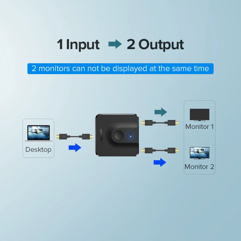 Ugreen HDMI switch can do bidirectional work, help you connect two HDMI sources to one HDMI display Or connect one HDMI source to toggle between two displays (2 monitors CANNOT display simultaneously.)