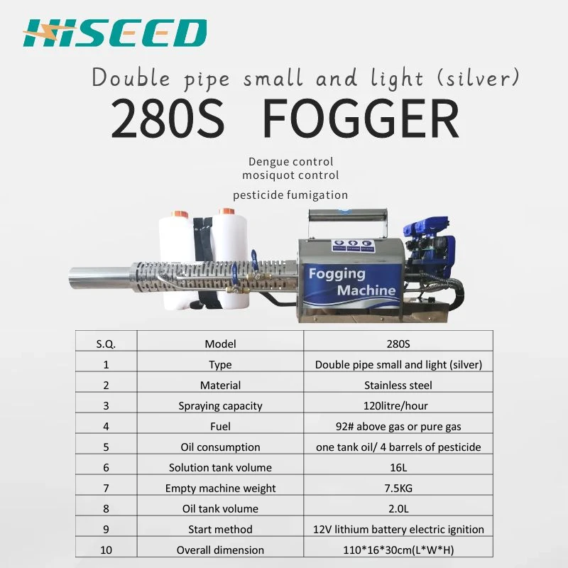 S.Q. Model 280S1 Type Double pipe small and light (silver)2 Material Stainless steel3 Spraying capacity 120litre/hour4 Fuel 92# above gas or pure gas5 Oil consumption one tank oil/ 4 barrels of pesticide liquid6 Solution tank volume 16L7 Empty machine weight 7.5KG8 Oil tank volume 2.0L9 Start method 12V lithium battery electric ignition10 Overall dimension 110*16*30cm(L*W*H)