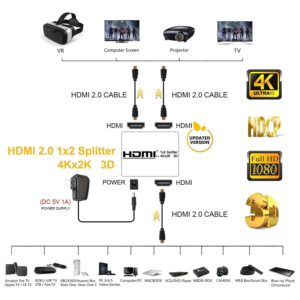 Best Price Comparison With 2020 New 4K 60Hz HDMI Splitter 2.0 HDMI 2.0 Splitter 1x2 Splitter HDMI 2.0 4K Support HDCP 1.4 UHD Amplifier For PS4 Projector