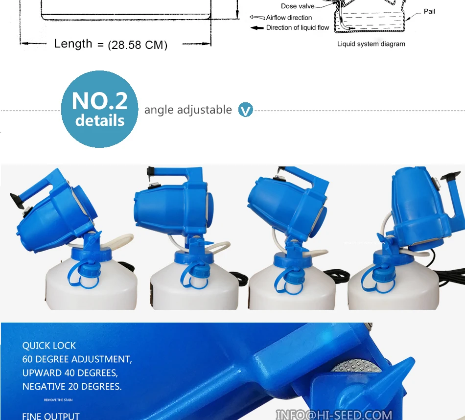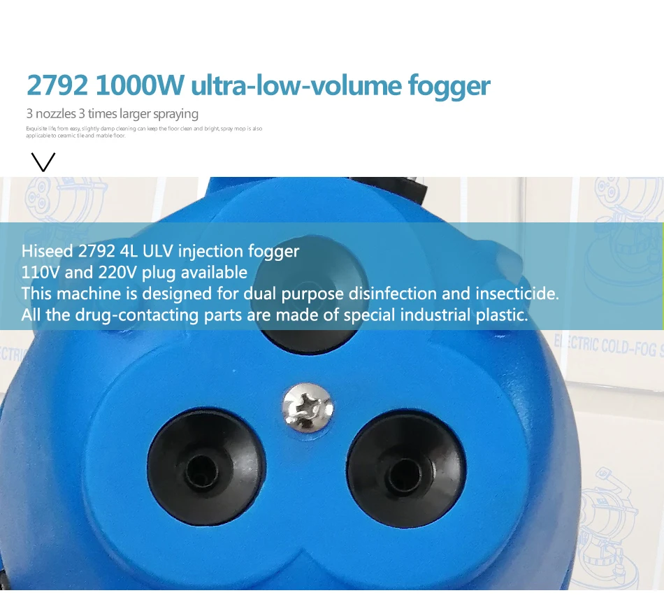 Hot Sell Mosquito Fog Machine/Thermal FoggerThis machine is designed for dual purpose disinfection and insecticide.Its fastest spraying the pesticide into the air and can keep stay on the airThe thermal foggers are mainly used in pest control and fumigation control of public places such as houses, restaurants, shops, warehouse, school communities, hospitals, etc. and is widely used in health and epidemic prevention departments, military bases and vegetable greenhouses. It can quickly kill outdoor gardens, insects, mosquitoes, etc. to eliminate epidemic prevention operations.Electric ultra-low sprayer portable sprayer indoor hospital district mosquito killing insecticide disinfection humidifierProduct name 2792 ULV cold sprayerBrand HDTank volume 4LVoltage 220V/110V 50-60HZPower 1000wDimension 25*42*25cmSpray nozzle 210mmSpray capacity 0-19L/ hDrop size 7-30μmCable length 5mThis machine is designed for dual purpose disinfection and insecticide. All the drug-contacting parts of the whole machine are made of special industrial plastic.Three nozzles, 4 ”diameter air inlet and washable filter to ensure low temperature operation of the machine head, equipped with spray regulating valveSuitable for various emulsifiable aqueous preparations, it is the ideal equipment for disinfection and insecticide service companies.The main purpose:Anti-SARS, Anti-Dengue Corona virus Fighter ·Made of high-density polyethylene industrial plastic. High-strength acid and alkali resistant. Peroxyacetic acid can be sprayed.