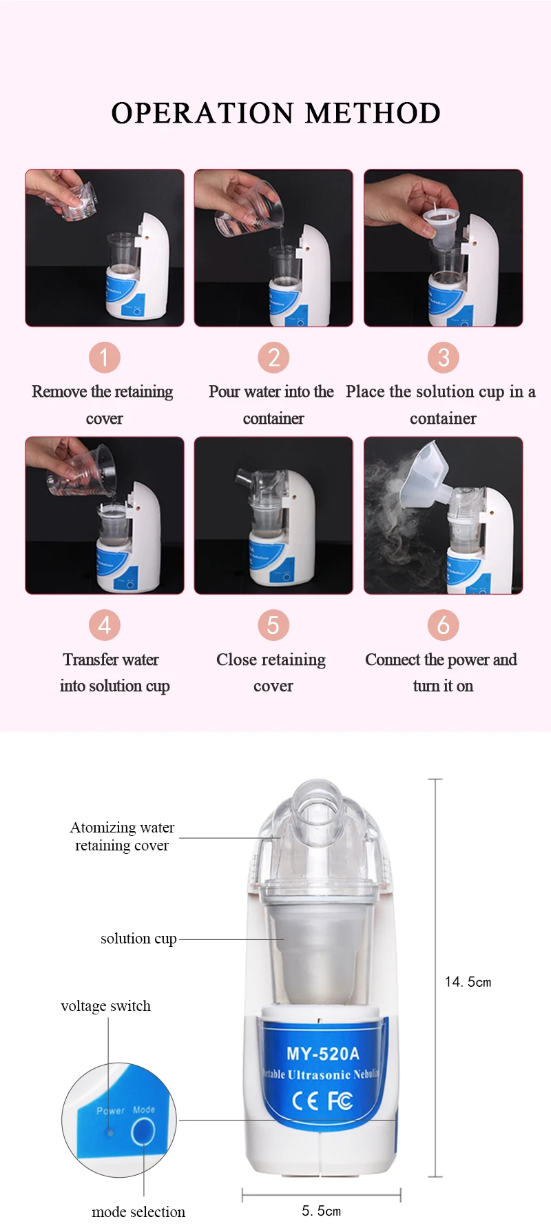 1. Portable Asthma Atomizer 2. Ideal product for families, used for the beauty. Besides skin care and used for interior humidifying in a powerful and efficient way.3. Cool mist, Comes on instantly, No waiting.4. 2 airflow speeds for you to choose from- super/normal;5. Suitable for all age, can be used by both kids and adults/quiet,Lightweight6. CE Approval, Safey test passed.