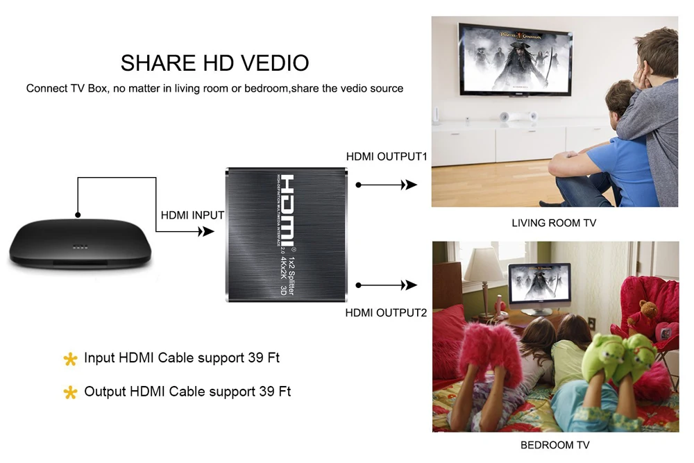 ZY-HS20A, 1x2 HDMI 2.0 Splitter uses a single HDMI source,accessing to multiple HDMI sinks. It allows one HDMI device to be split easily to 2 HDMI compatible monitors or projectors. In addition,it can be placed at the end of a long HDMI cable to regenerate the HDMI signal. The resolution of this hdmi splitter can be up to 4K*2K@60Hz.