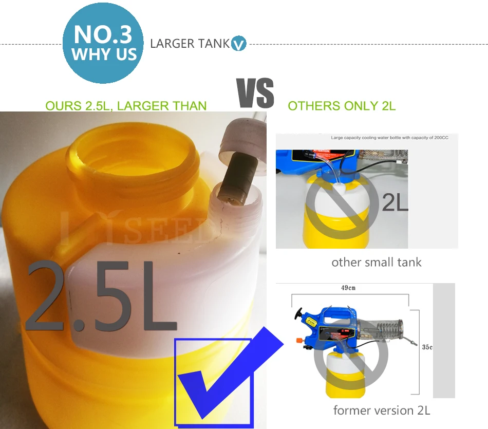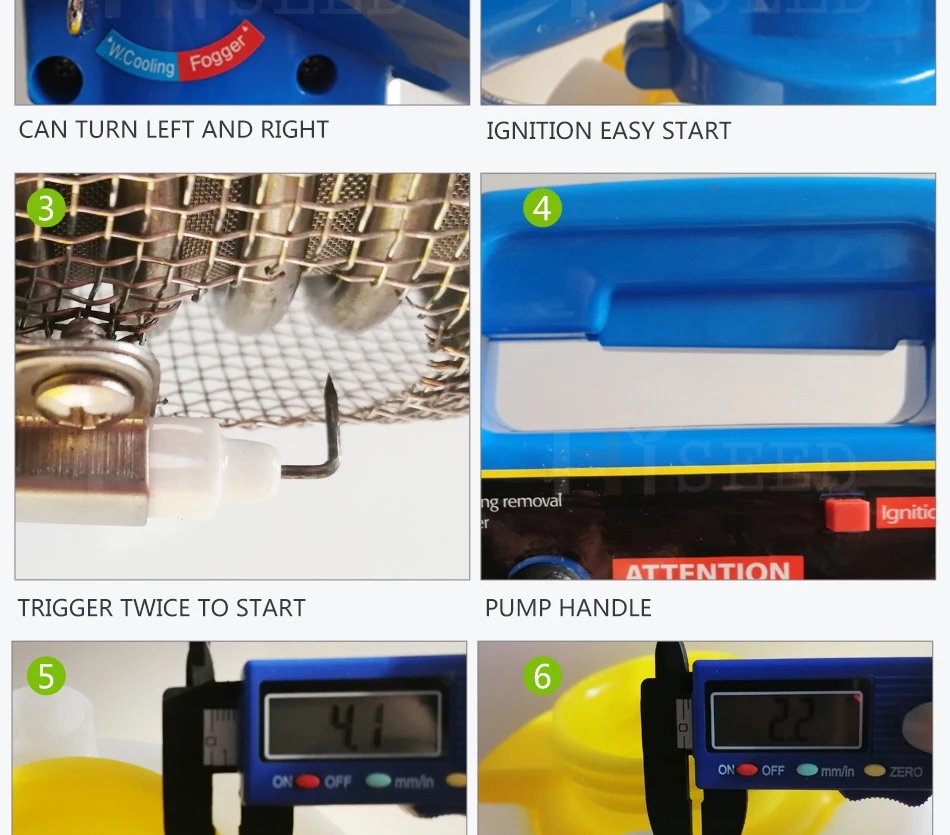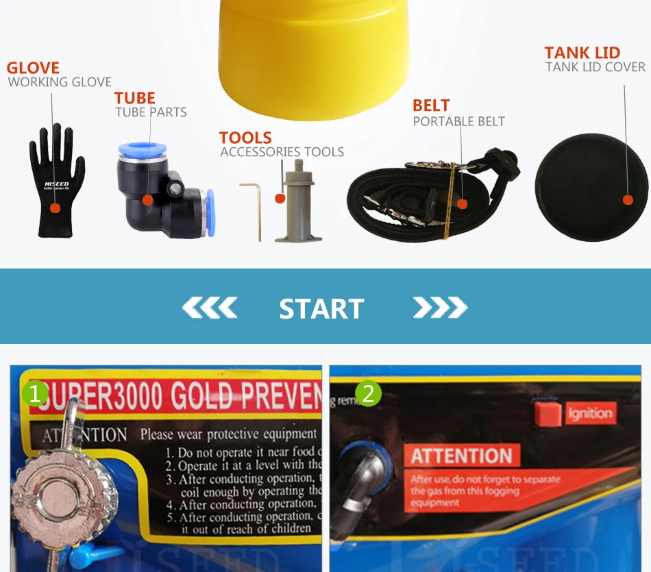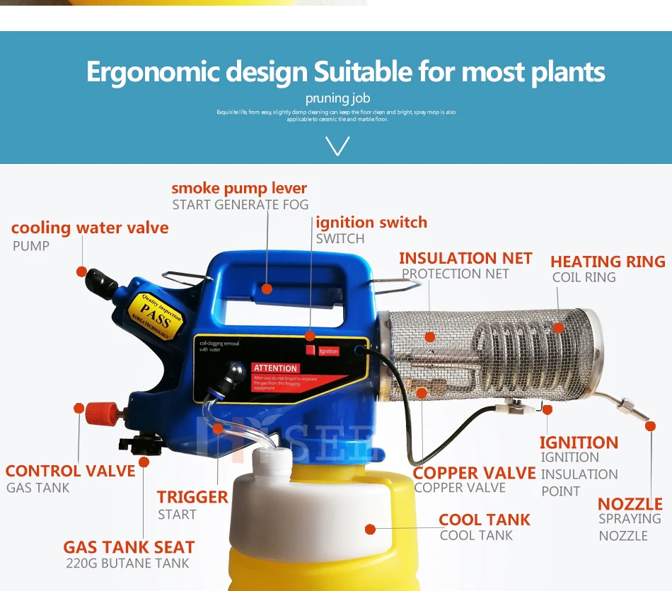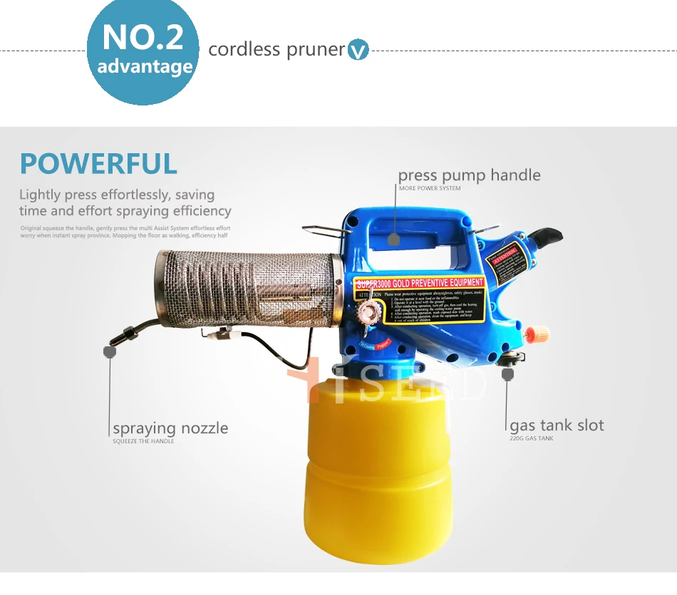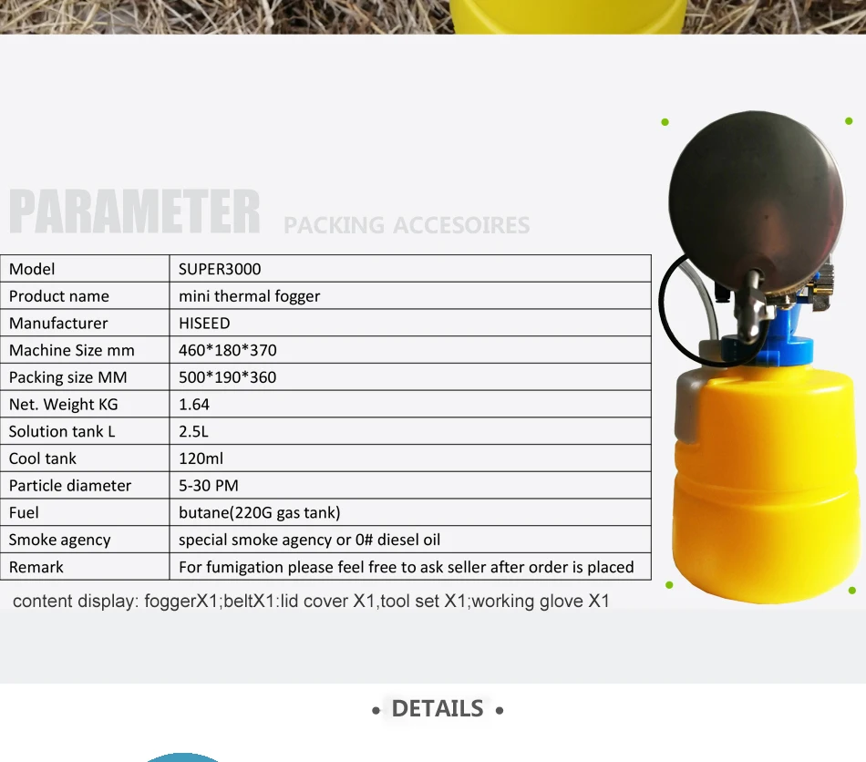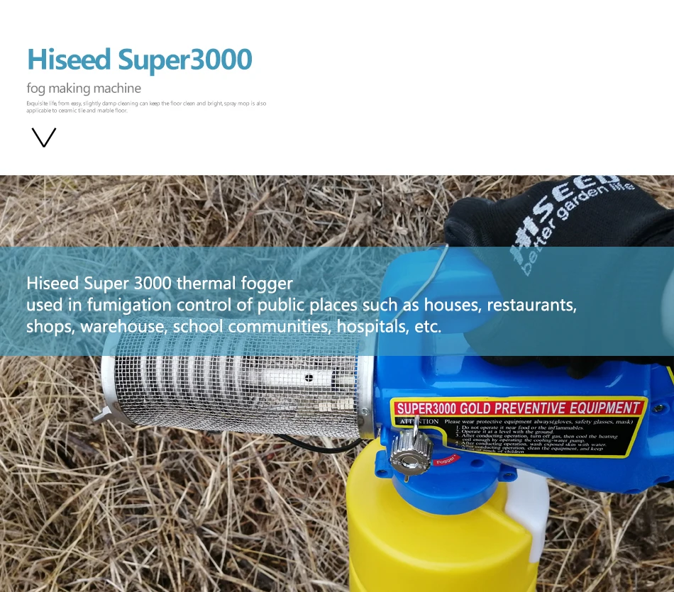 Model SUPER3000Product name mini thermal foggerManufacturer HISEEDMachine Size mm 460*180*370Packing size MM 500*190*360Net. Weight KG 1.64Solution tank L 2.5LCool tank 120mlParticle diameter 5-30 PMFuel butane(220G gas tank)Smoke agency special smoke agency or 0# diesel oilRemark For fumigation please feel free to ask seller after order is placedIt is mainly used in fumigation control of public places such as houses, restaurants, shops, warehouse, school communities, hospitals, etc. and is widely used in health and epidemic prevention departments, military bases and vegetable greenhouses. It can quickly kill outdoor gardens, insects, mosquitoes, etc. to eliminate epidemic prevention operations.Also known as the disinfection machine insecticide spray machine. Pulsed thermal smoke generator. Plant protection fog machine. Agricultural smoke generator. Butane smoker. Thermal smoke machine. Household disinfection and anti-epidemic micro-fume. Disinfector insecticide sprayer.The pulsed thermal smoke generator has a reasonable structure, light weight, no noise and easy operation. The liquid is fully atomized when spraying, and the particle size of the drug mist is less than 50 microns. The drug mist can be diffused in the working area for a long time, achieving all-round deposition, strong penetrability, no dead angle, and good insecticidal sterilization effect.It is mainly used in fumigation control of public places such as houses, restaurants, shops, warehouse, school communities, hospitals, etc. and is widely used in health and epidemic prevention departments, military bases and vegetable greenhouses. It can quickly kill outdoor gardens, insects, mosquitoes, etc. to eliminate epidemic prevention operations.
