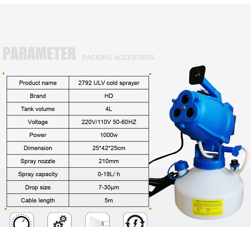 Hot Sell Mosquito Fog Machine/Thermal FoggerThis machine is designed for dual purpose disinfection and insecticide.Its fastest spraying the pesticide into the air and can keep stay on the airThe thermal foggers are mainly used in pest control and fumigation control of public places such as houses, restaurants, shops, warehouse, school communities, hospitals, etc. and is widely used in health and epidemic prevention departments, military bases and vegetable greenhouses. It can quickly kill outdoor gardens, insects, mosquitoes, etc. to eliminate epidemic prevention operations.Electric ultra-low sprayer portable sprayer indoor hospital district mosquito killing insecticide disinfection humidifierProduct name 2792 ULV cold sprayerBrand HDTank volume 4LVoltage 220V/110V 50-60HZPower 1000wDimension 25*42*25cmSpray nozzle 210mmSpray capacity 0-19L/ hDrop size 7-30μmCable length 5mThis machine is designed for dual purpose disinfection and insecticide. All the drug-contacting parts of the whole machine are made of special industrial plastic.Three nozzles, 4 ”diameter air inlet and washable filter to ensure low temperature operation of the machine head, equipped with spray regulating valveSuitable for various emulsifiable aqueous preparations, it is the ideal equipment for disinfection and insecticide service companies.The main purpose:Anti-SARS, Anti-Dengue Corona virus Fighter ·Made of high-density polyethylene industrial plastic. High-strength acid and alkali resistant. Peroxyacetic acid can be sprayed.